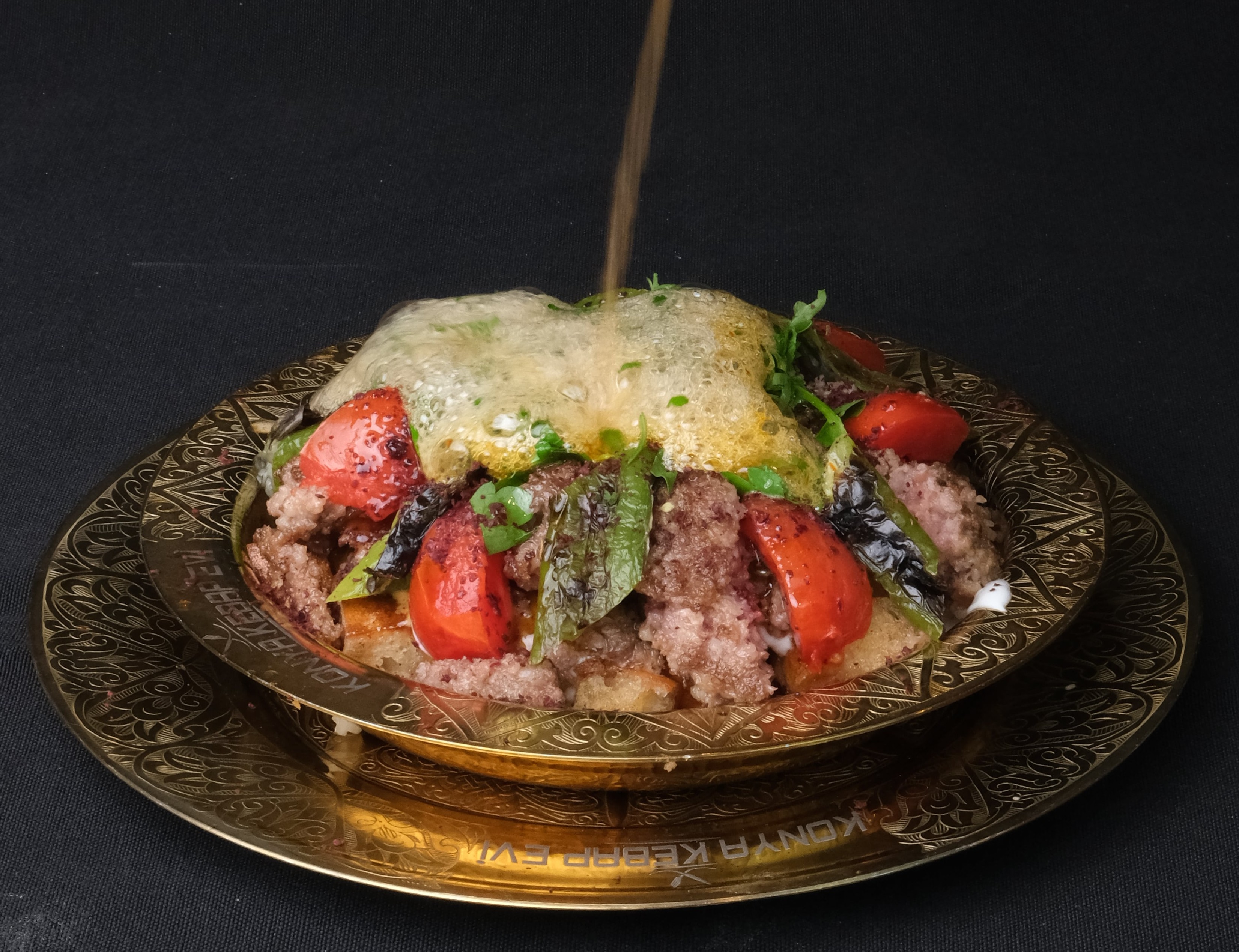 Mevlevi mutfağının ekmekli etli sunumu: Et suyuyla ıslatılan yufka üzerine dökülen sıcak etle geleneksel bir lezzet şöleni sunar.
